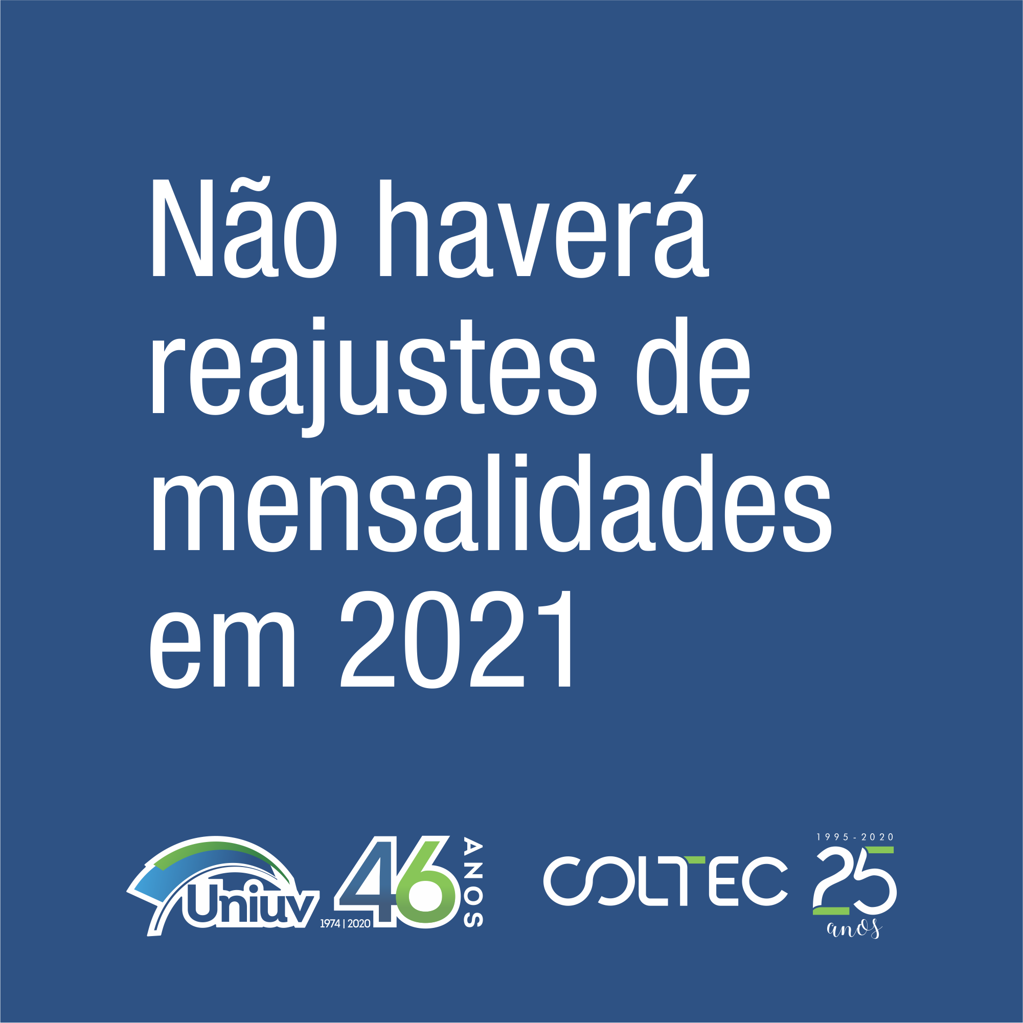 Preocupada com a comunidade acadêmica, diante das situações provocadas pela pandemia de Covid-19, a UNIUV aprovou por meio dos conselhos superiores o não reajuste para as mensalidades dos cursos superiores, de pós-graduação e do Colégio (COLTEC) para o próximo ano letivo. A medida pretende beneficiar os estudantes e responsáveis, para que possam se organizar da melhor maneira possível durante este período de pandemia pelo qual está se passando.