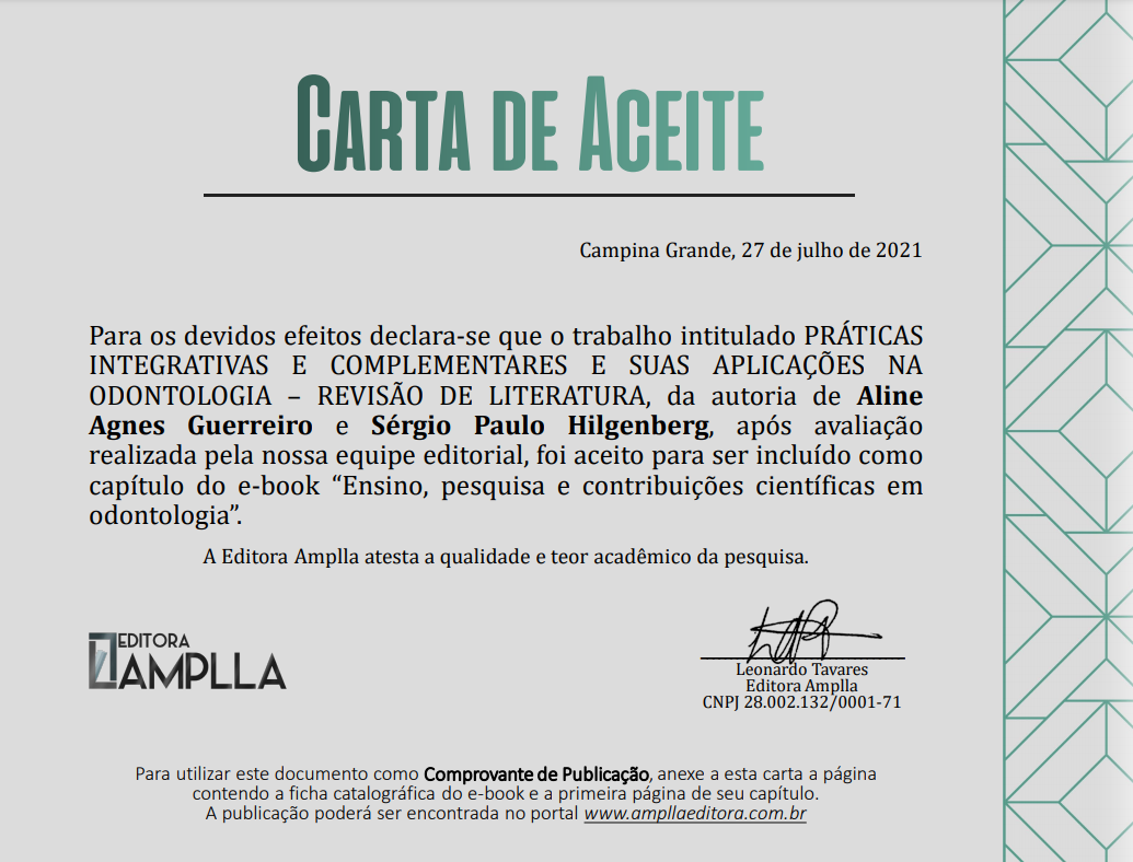 A acadêmica Aline Agnes Guerreiro e o Prof. Dr. Sérgio Hilgenberg tiveram o trabalho intitulado “Práticas integrativas e complementares e suas aplicações na odontologia” aprovado para fazer parte de capítulo do e-book “Ensino, Pesquisa e contribuições científicas em odontologia”, a ser publicado pela Editora Amplla.