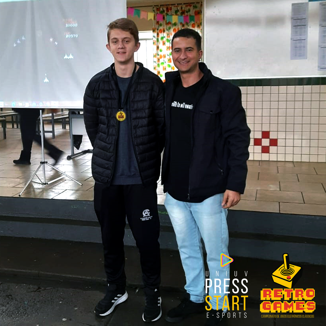 Mais uma etapa do Retro Games Uniuv foi realizada, desta vez no EEB Antonio Gonzaga, e os representantes selecionados são: Arthur Manrich Frei, campeão de PAC-MAN, e Luis Felipe Bruske, campeão de GALAGA. As etapas seletivas serão realizadas em diversas escolas, buscando os melhores jogadores de PAC-MAN e GALAGA, e uma grande competição final está sendo preparada no Cineteatro Luz. Agradecemos o total apoio do colégio para a realização desta etapa seletiva.