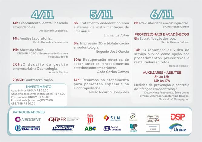 Para os auxiliares ASB/TSB, no dia 06, das 08h às 12h e das 14h às 17h, haverá palestra sobre Medidas de prevenção e controle de infecção em odontologia, com os profissionais Dulce Mara Prescendo, Érica Lopes Ferreira, Jeferson Contantino Droppa e Cesar José Campagnoli.