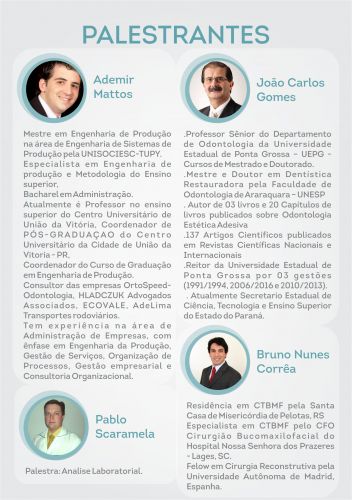 Na sexta-feira, os temas das palestras são Previsibilidade em cirurgia oral, com Bruno Nunes Correa, e Estratificação de risco, com Marcia Helena Baldoni, em parceria com CRO – PR. As duas palestras acontecem às 08h. No período da tarde, com início às 14h, Renata Verneck abordará o tema O ionômetro de vidro no serviço público como opção nos procedimentos preventivos e restauradores diretos.