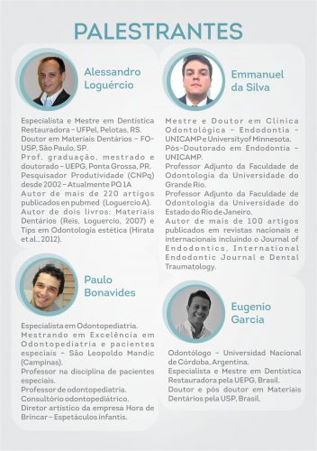 No dia 05, o evento tem início às 08h, com os palestrantes Emmanuel Silva que tratará sobre o tema Tratamento endodôntico com sistemas de instrumentação de lima única. E com Eugenio José Garcia que abordará o tema Impressão 3D e biofabricação em odontologia.