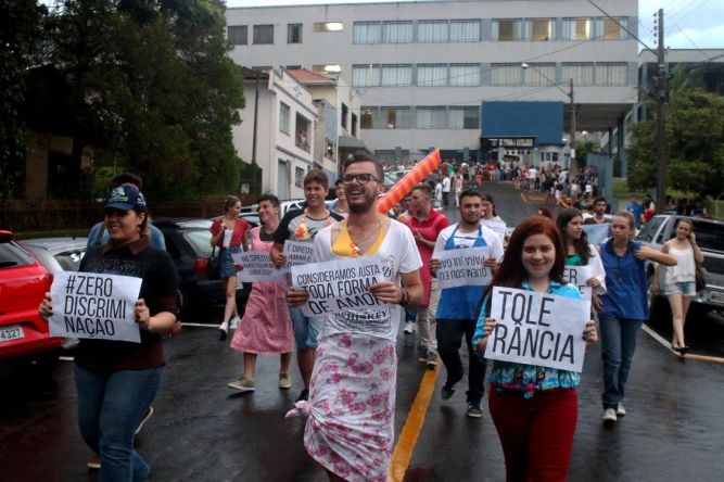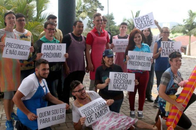 Na sexta-feira, 19, os acadêmicos trocaram de papéis, os homens vestidos com roupas de mulher e as mulheres com roupas de homem e passearam pelo pátio da instituição com frases que diziam um trote contra o preconceito, diversidade, amor ao próximo, quem sou eu para julgar, respeito, vamos falar mais sobre isso?